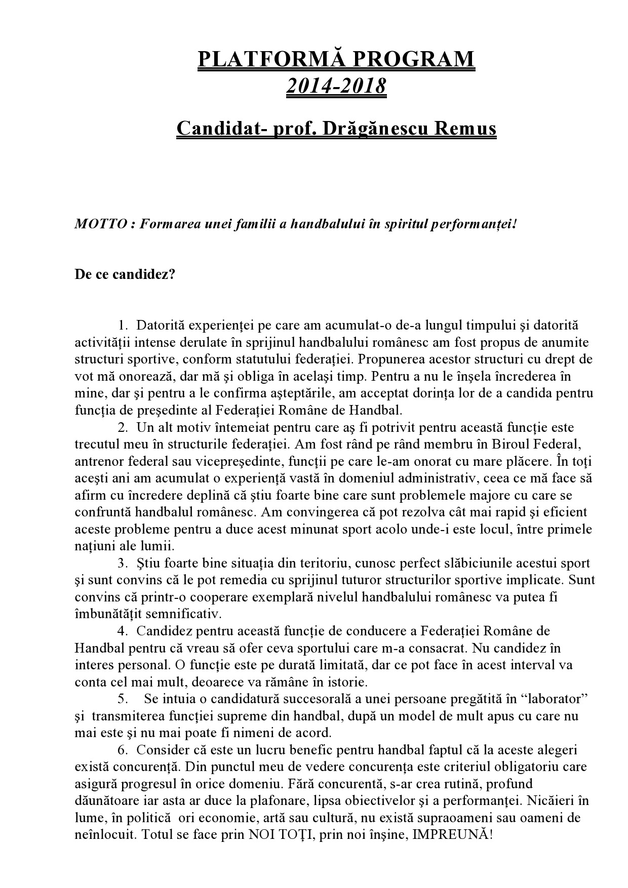 20 ianuarie este ultima zi în care candidaţii la preşedinţia Federaţiei Române de Handbal îşi pot depune platformele program. În timp ce atât actualul preşedinte, Cristian Gaţu, cât şi Alexandru Dedu, fostul mare handbalist al României, şi-au prezentat deja programele, cel de-al treilea candidat, profesorul Remus Drăgănescu, îşi va anunţa platforma în cursul zilei de astăzi, platformă care vă este prezentată în exclusivitate de Sport Revolution.