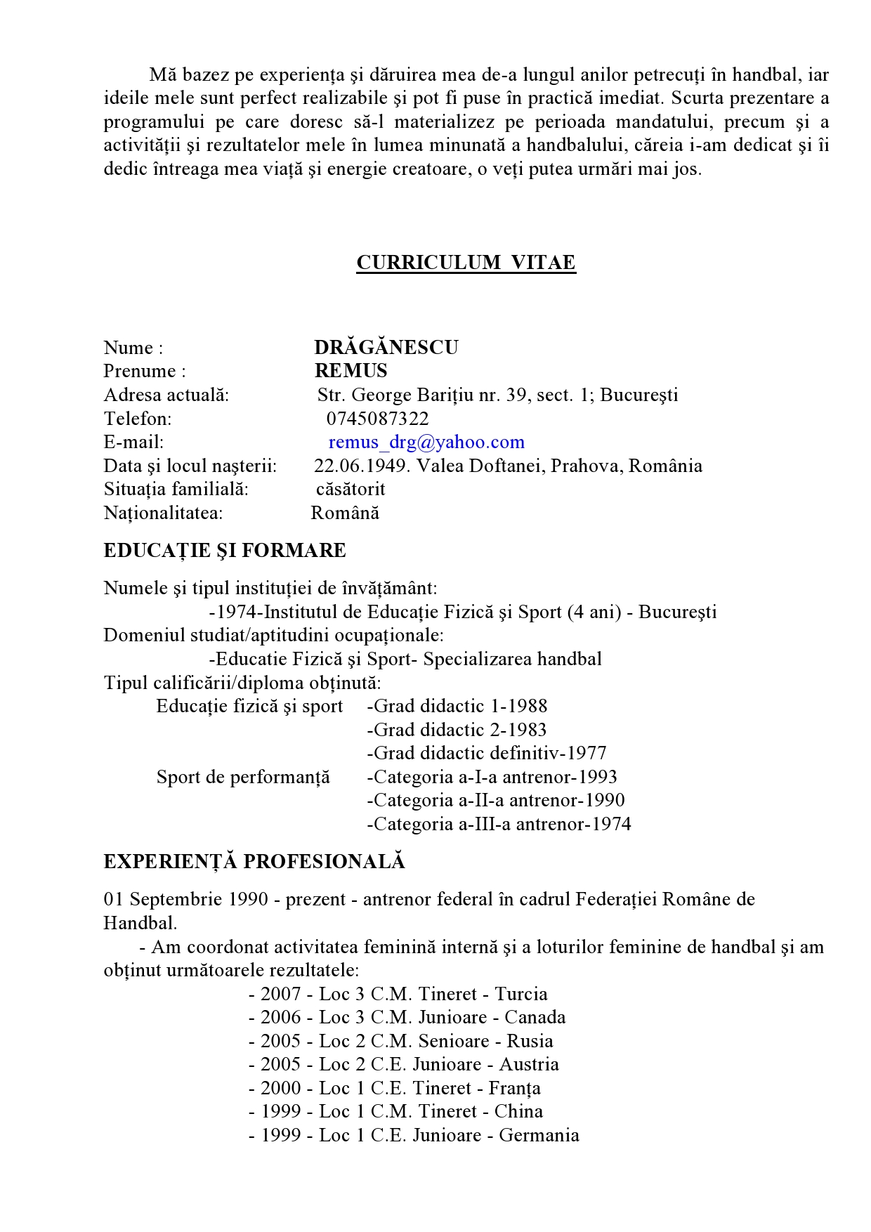Născut pe 22 iunie 1949 în Valea Doftanei (jud. Prahova), profesorul Remus Drăgănescu este un adevărat nume în lumea handbalului feminin autohton, fiind fost antrenor al loturilor naţionale de tineret şi senioare şi actual antrenor federal în cadrul Federaţiei Române de Handbal. Printre obiectivele sale se numără, pe lângă colaborarea cu MTS, MEN şi asociaţii sportive, crearea unui departament de marketing şi comunicare. “Fără un marketing eficient, handbalul românesc nu poate avea viitor“, se arată în platforma program a candidatului. De asemenea, Drăgănescu optează şi pentru înfiinţarea unui departament juridic.
