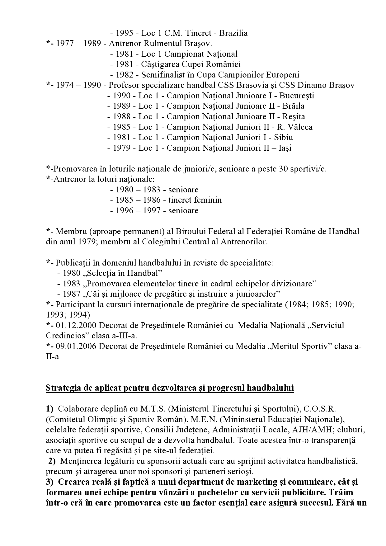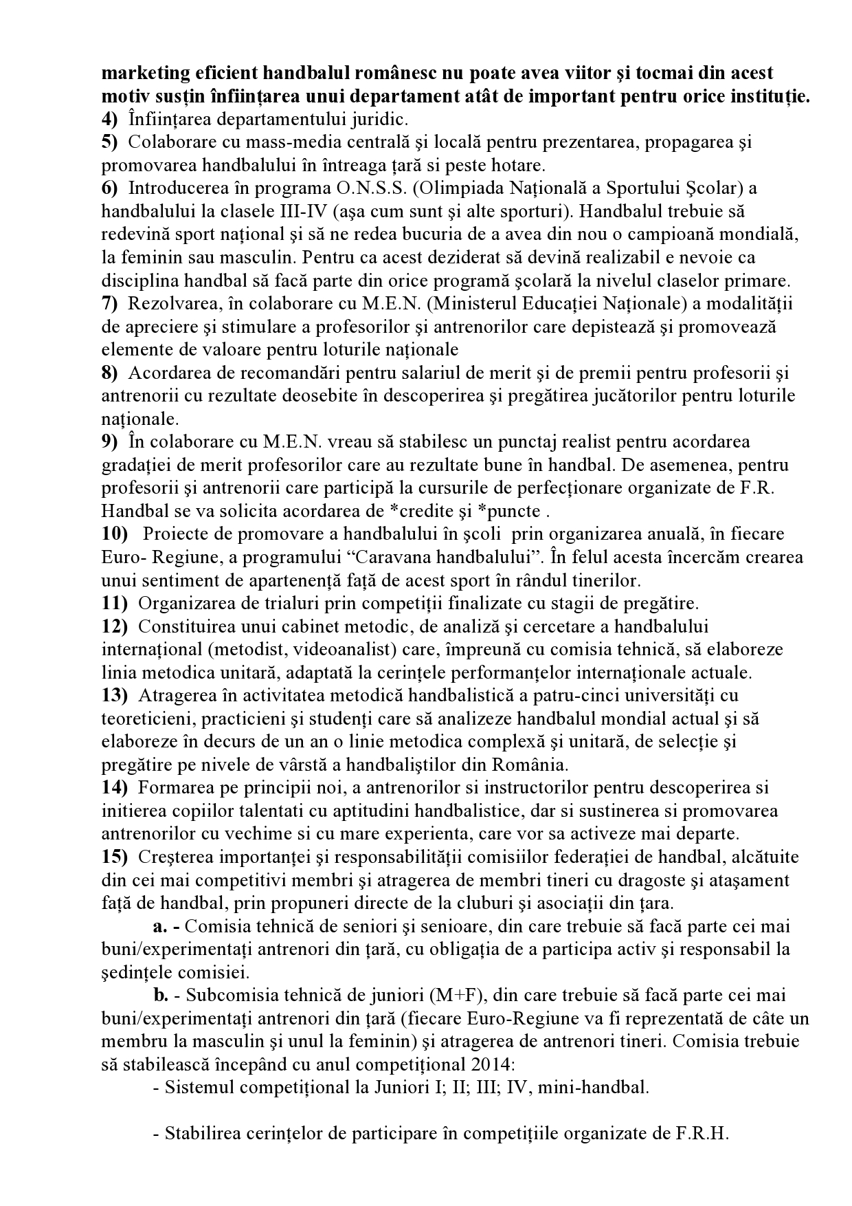 De asemenea, printre proiectele sale se numără înfiinţarea Ligii Profesioniste de Handbal, a unor comisii de handbal de stardă şi handbal de plajă, precum şi înfiinţarea unei “Case a Handbalului”, după modelul altor sporturi: fotbal, rugby sau atletism.