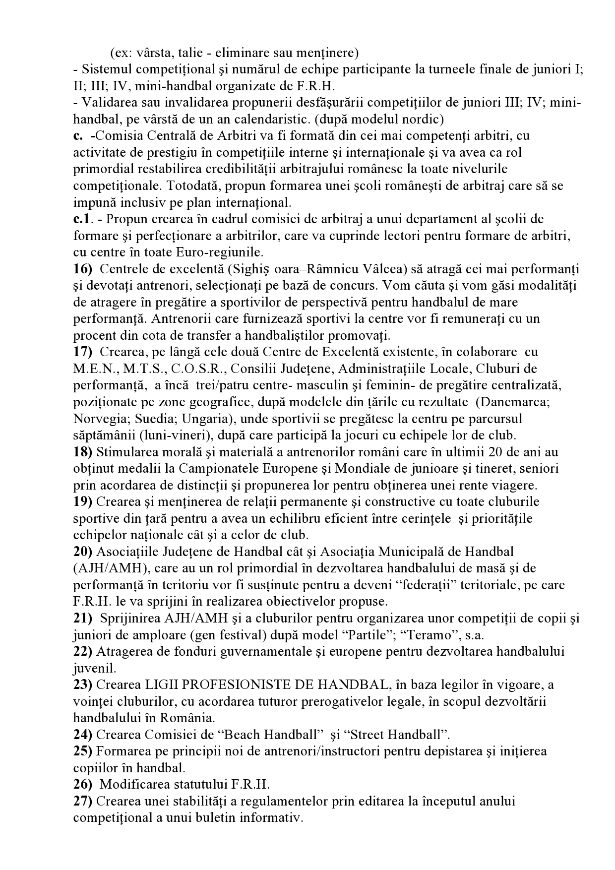 Multe alte obiective din program au legătură cu domeniul educaţiei. Printre acestea se numără introducerea handbalului la clasele III-IV în programa Olimpiadei Naţionale a Sportului Şcolar, dar şi aprecierea şi stimularea profesorilor şi antrenorilor care promovează acest sport. Drăgănescu pune accent şi pe potenţialul de dezvoltare a handbalului, propunând înfiinţarea a trei-patru centre de pregătire centralizată, poziţionate pe zone geografice.