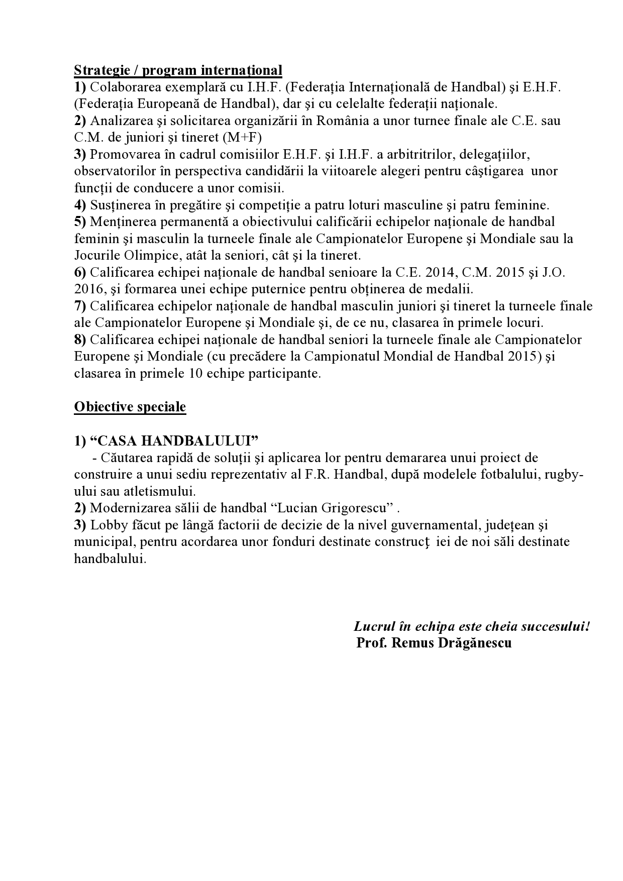 Pe plan internaţional, Drăgănescu îşi doreşte “menţinerea permanentă a obiectivului calificării echipelor naţionale de handbal feminin şi masculin la turneele finale ale Campionatelor Europene şi Mondiale sau la Jocurile Olimpice, atât la seniori, cât şi la tineret“.