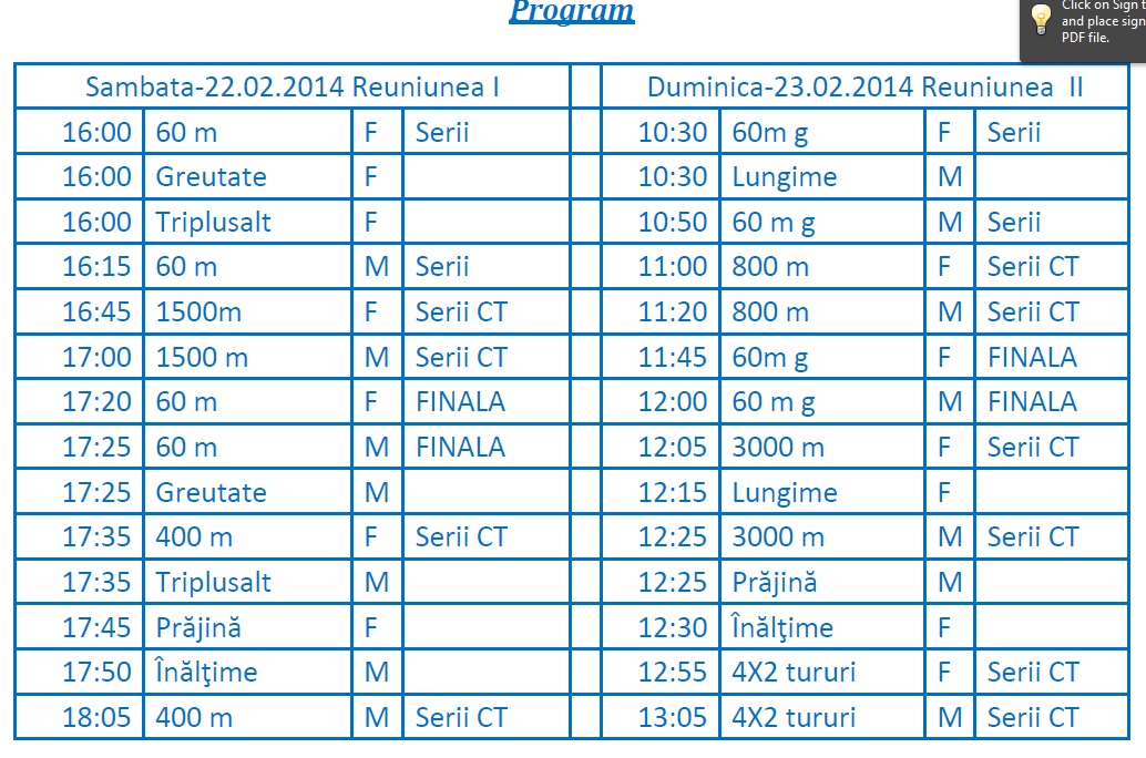 Sâmbătă și duminică (22 şi 23 februarie), în sala din cadrul CNSB „Lia Manoliu”, se vor desfășura Campionatele Naționale indoor rezervate juniorilor 1. Competiţia organizată de Federaţia Română de Atletism le va oferi prilejul tinerilor atleţi să-şi demonstreze calităţile în vederea prinderii lotului naţional. Click pentru imagine pentru a vedea programul complet al concursului destinat juniorilor 1.