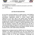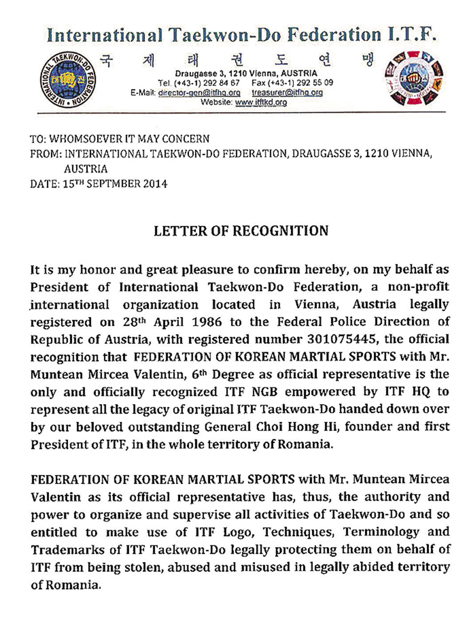 O delegaţie a noii federaţii, formată din Preşedintele Mircea Muntean, Vicepreşedintele Romeo Tulkos şi membru al Biroului Federal Minerva Mucichescu, se deplasează la Viena, la sediul ITF, unde primeşte recunoaşterea dreptului de a practica Taekwon-Do ITF în România. Hârtia este primită chiar din mâna preşedintelui ITF, Prof. Dr. Chang Ung, membru al Comitetului Olimpic Internaţional.