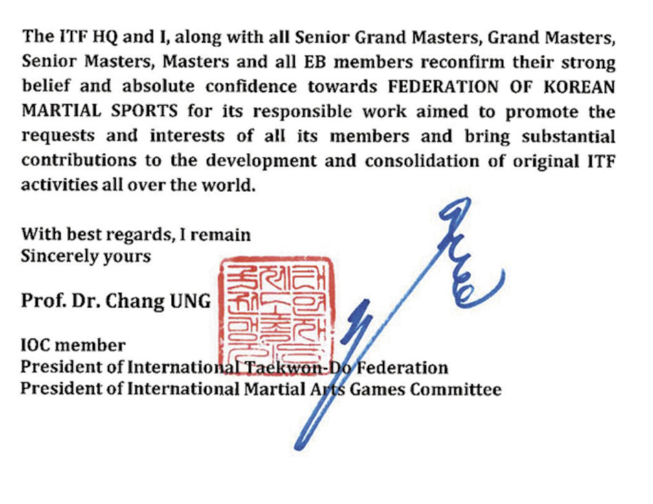 În urma acestei întâlniri, la care este prezentat proiectul din România, se primeşte acordul ITF pentru înfiinţarea Federaţiei de Sporturi Marţiale Coreene. De asemenea, se planifică organizarea unui stagiu tehnic internaţional şi un stagiu de arbitraj. Prezent la întâlnire, Master Emin Durakovic 7 DAN, Președintele Corpului European de Arbitraj, asigură delegaţia României de suportul său personal necondiţionat.