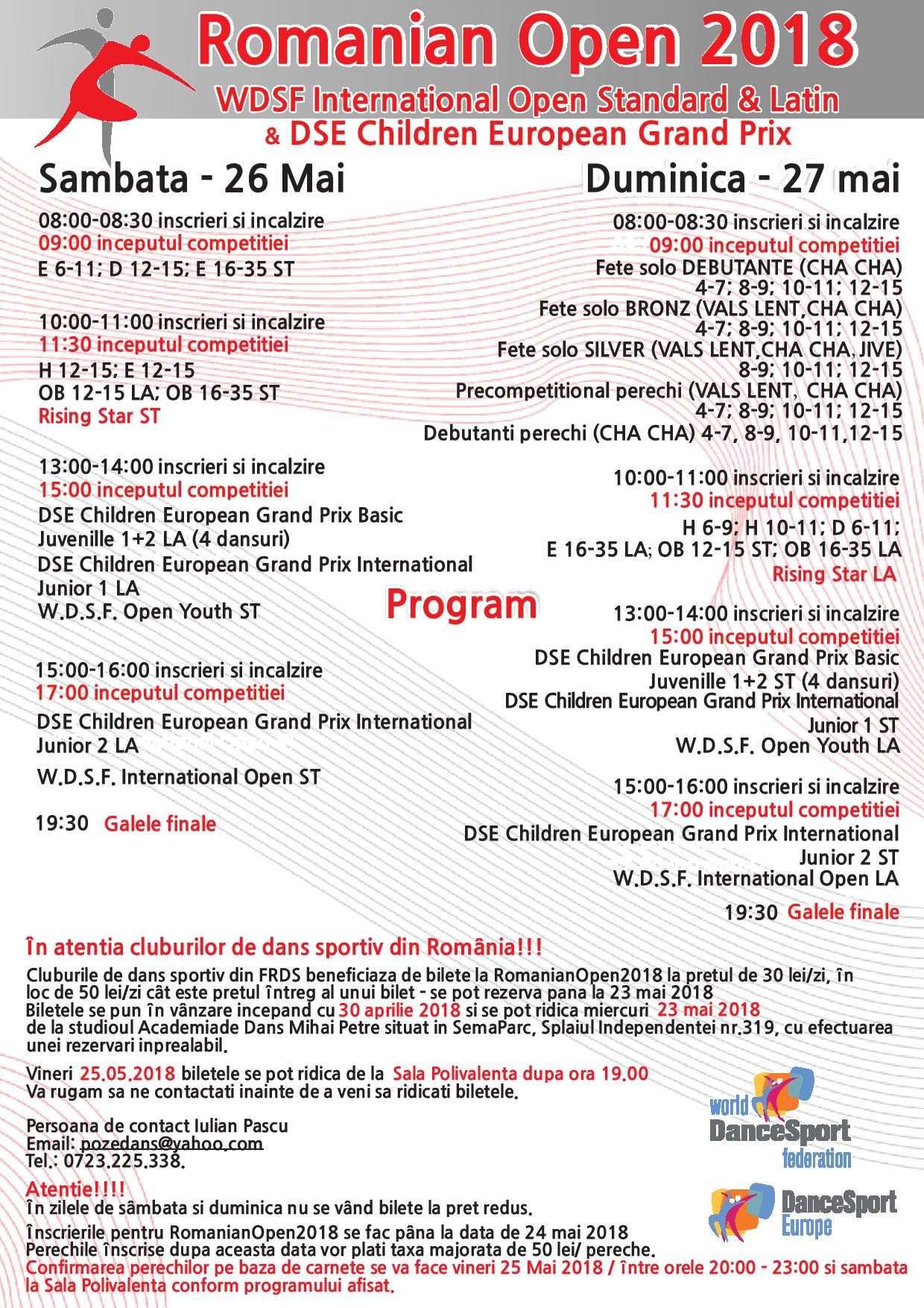 Atât sâmbătă, cât și duminică, de la ora 19.00, vor avea loc galele Romanian Open și pentru că avem niște super nume din lumea dansului sportiv, vă promit un spectacol extraordinar”, a declarat Mihai Petre.